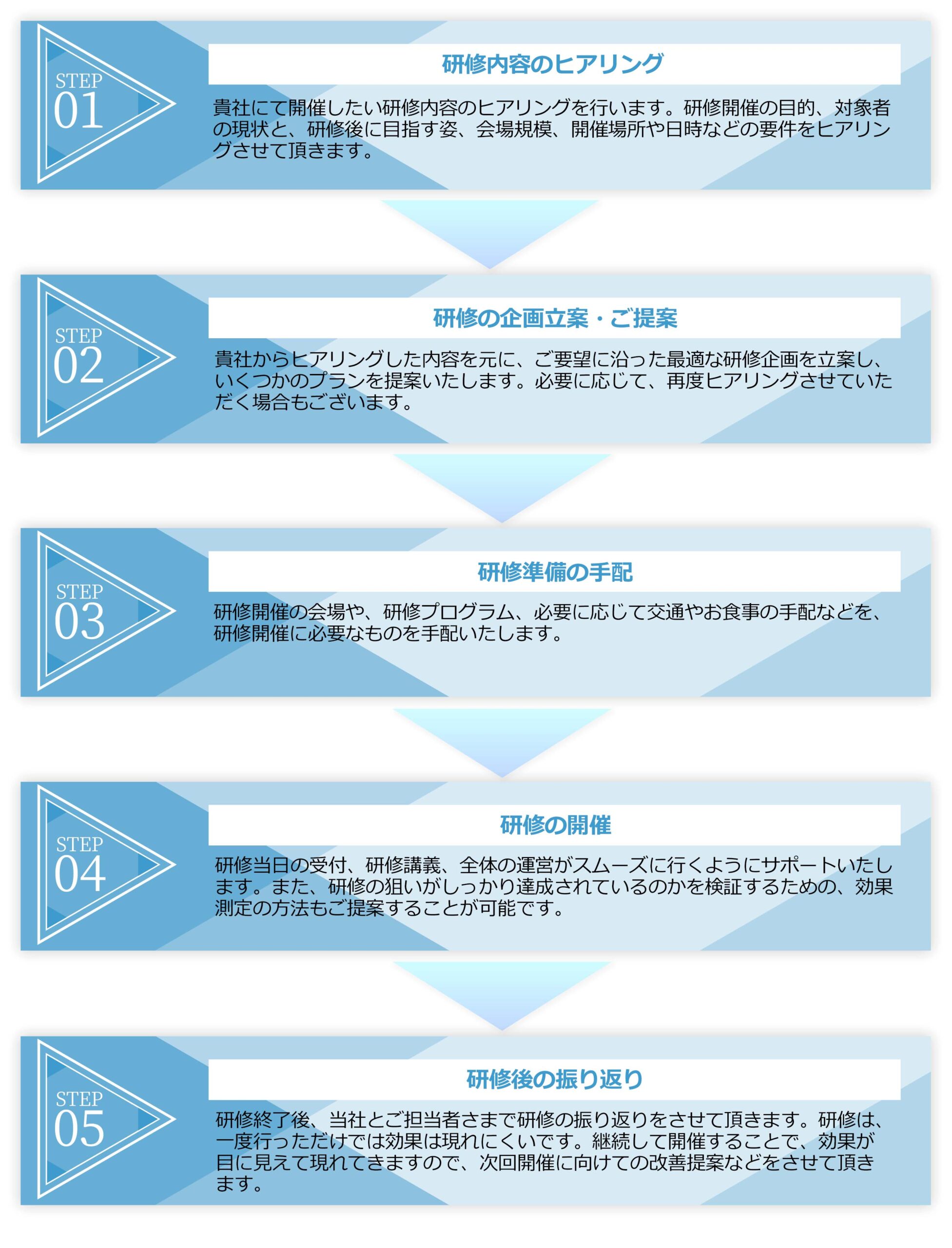 研修・セミナーの実施目的や対象者に合わせて、外部講演者やチームビルディングなど研修のプログラムなど、下記の流れで提案いたします。